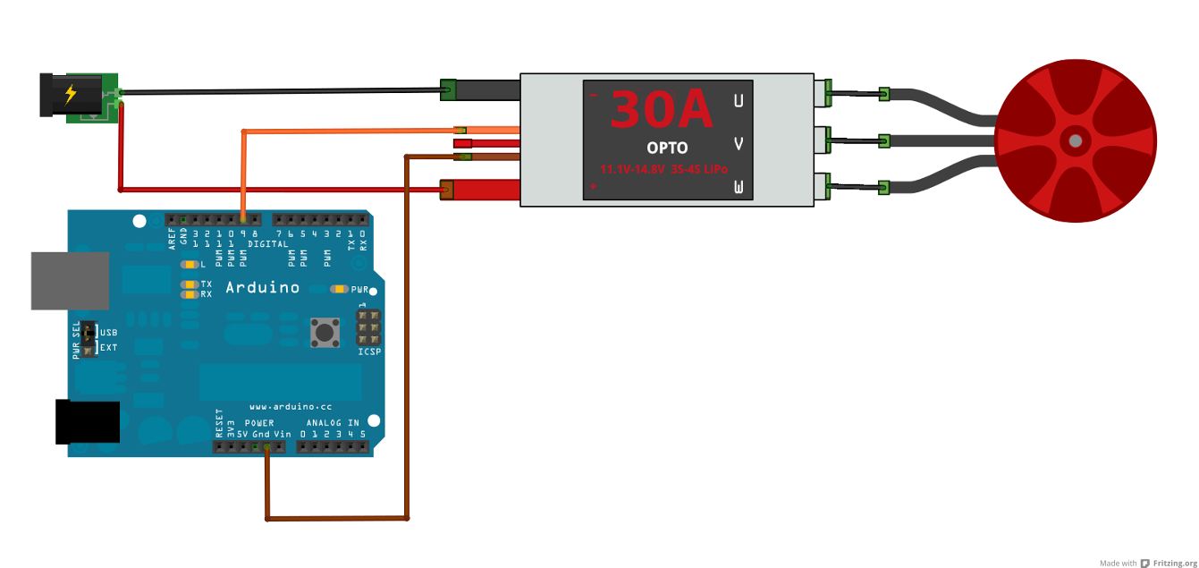 The code runs up the motor to 50% of maximum speed and then down again. This simple code allows me to make sure the flashed ESC is working post flashing. To run the sketch the ESC is connected to the Arduino as follows (image courtesy of http://robotic-controls.com/book/export/html/51):